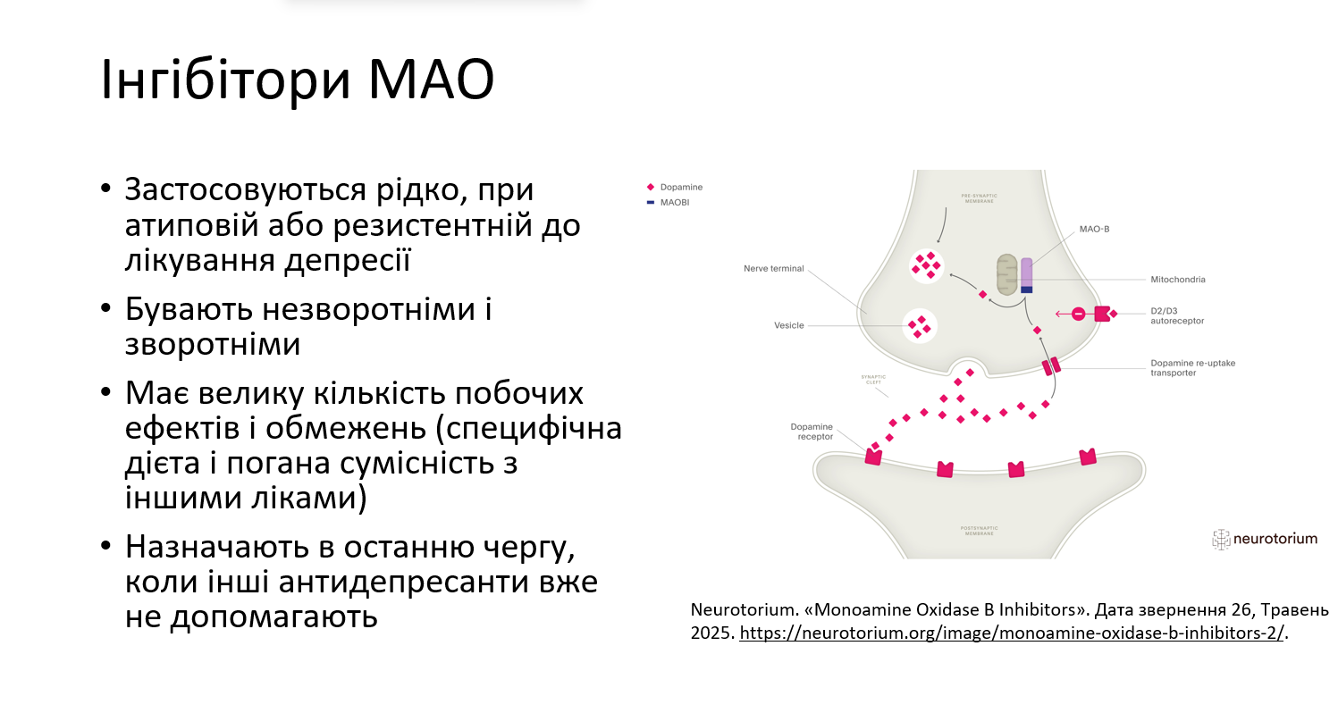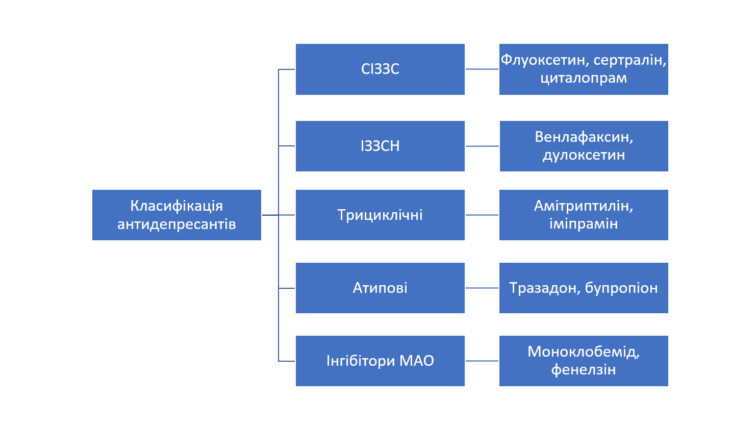 Антидепресанти – це загальна назва різних за хімічною структурою і механізмом дії психотропних речовин, які призначають для лікування низки психічних розладів і станів, зокрема депресій, тривожних розладів, ПТСР, ОКР, неврозів тощо. Вони діють на рівень нейромедіаторів у мозку, таких як серотонін, норадреналін та дофамін, котрі відіграють ключову роль у формуванні емоційного стану.