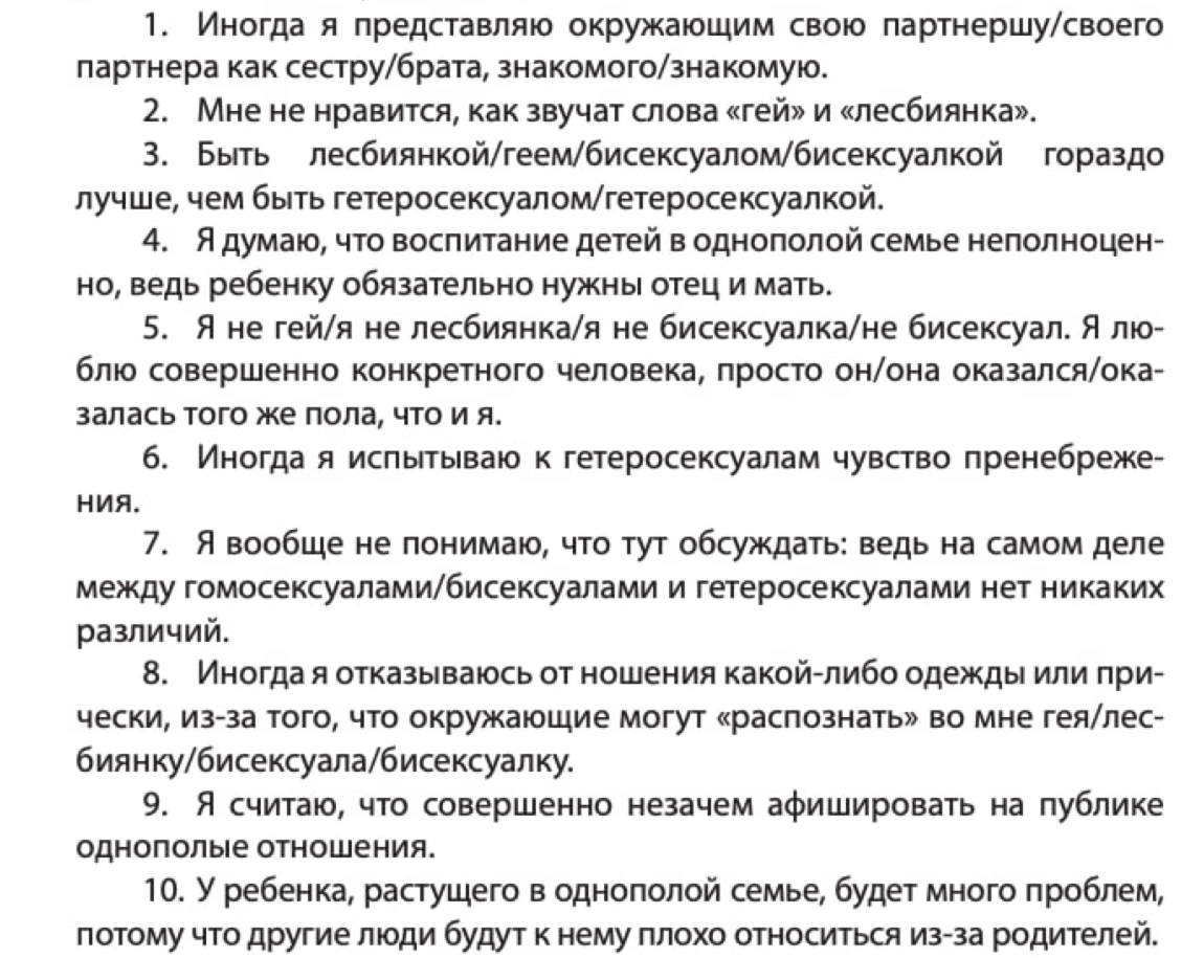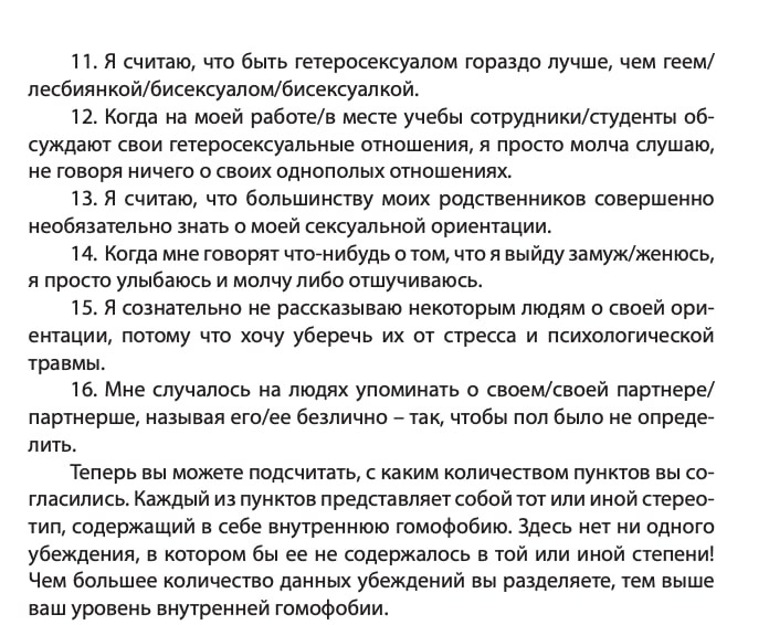 В дорослому віці ми залишаємось із розщепленням – головою розуміємо, що ми нормальні, але постійно відчуваємо, що з нами щось не так. Іноді ми навіть стаємо “по інший бік”. Тобто частина нас зневажає ЛГБТКІ+ спільноту, хоча ми самі до неї належимо. Нижче знайдете тест на інтерналізовану гомофобію.